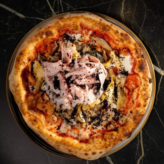 S. Marzano, fiordilatte di Agerola, funghi shiitake, carciofi, cotto alta qualità, terra di olive. | €14,00