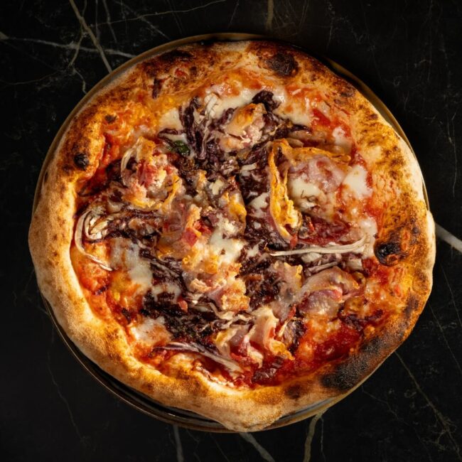 Fiordilatte di Agerola, radicchio brasato, nocciole del Piemonte IGP, ristretto di Sangiovese, fonduta di gorgonzola. | impasto integrale ai semi | €15,00
