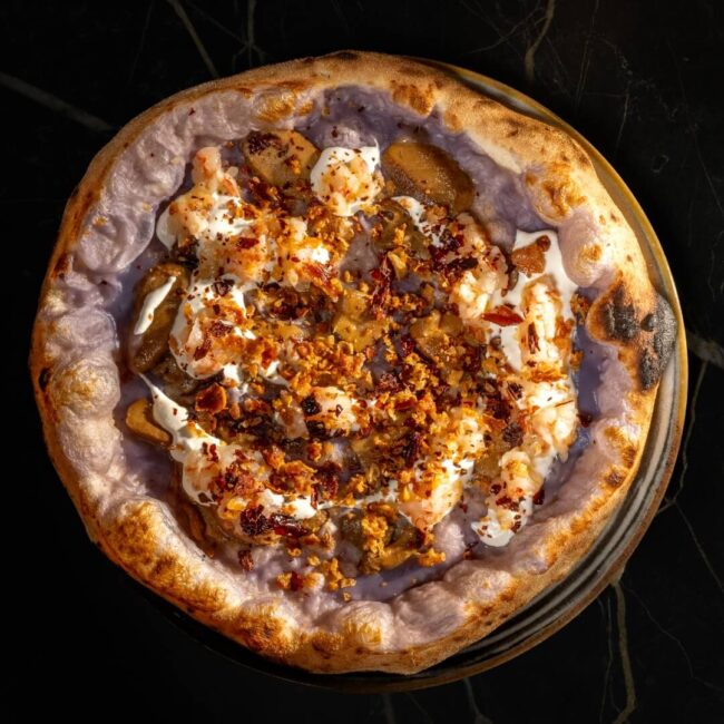 Crema di broccoli, fiordilatte di Agerola, salsiccia punta di coltello, cipolla di Tropea caramellata, ristretto di pomodoro all ‘nduja, ricotta salata. | Impasto integrale ai semi | €15,00